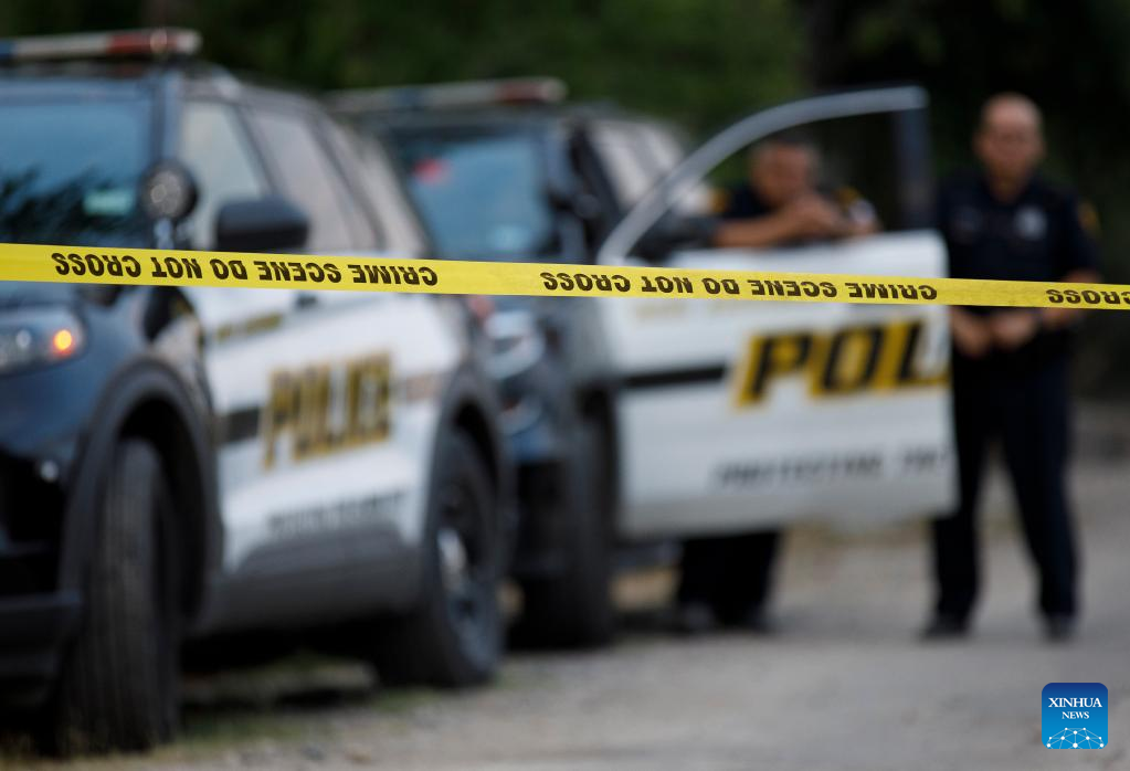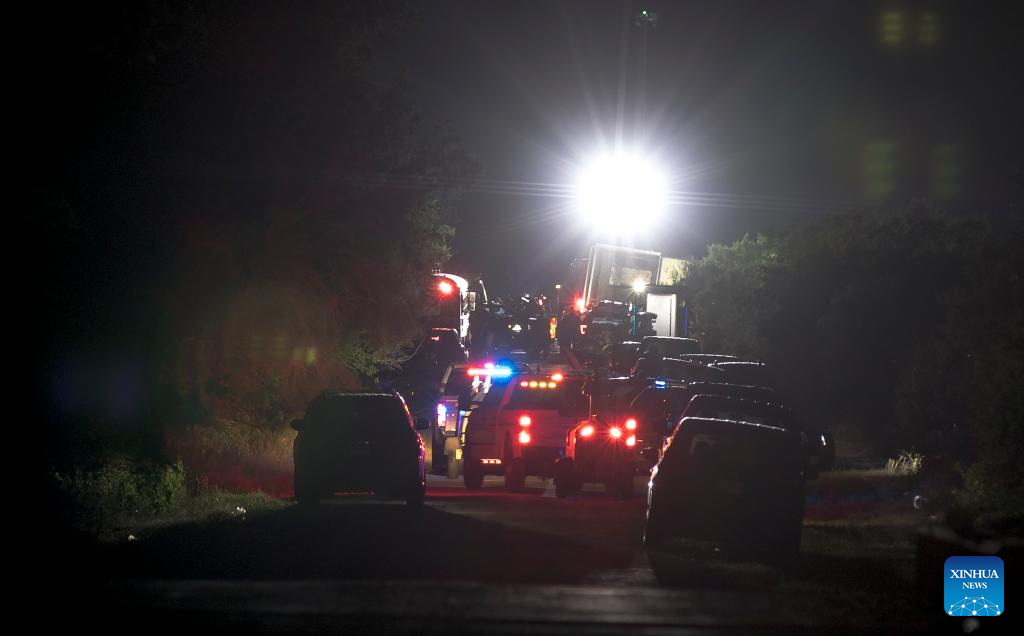 Photo taken on June 27, 2022 shows the scene of an alleged human smuggling mass casualty event in San Antonio, Texas, the United States. The death toll of migrants found on Monday inside a "cloned" and abandoned 18-wheeler in San Antonio has risen to 50, authorities said on Tuesday. (Photo by Nick Wagner/Xinhua)