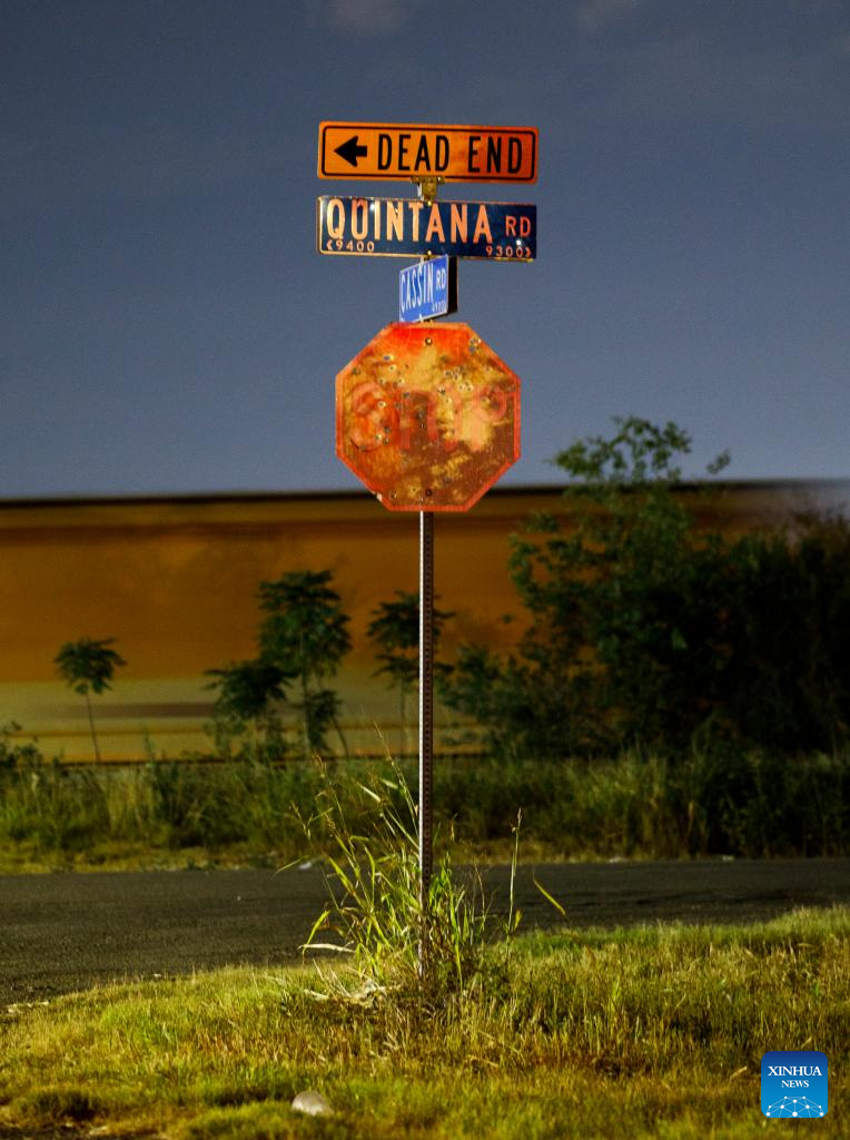 Photo taken on June 28, 2022 shows road signs near the scene of an alleged human smuggling mass casualty event in San Antonio, Texas, the United States. The death toll of migrants found on Monday inside a "cloned" and abandoned 18-wheeler in San Antonio has risen to 50, authorities said on Tuesday. (Photo by Nick Wagner/Xinhua)