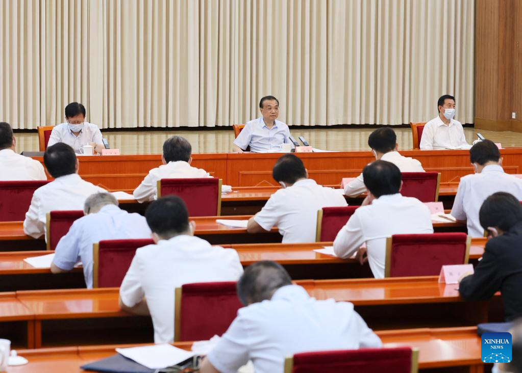 Chinese Premier Li Keqiang, also a member of the Standing Committee of the Political Bureau of the Communist Party of China Central Committee, chairs a symposium during an inspection tour to the Ministry of Civil Affairs and the Ministry of Human Resources and Social Security, June 27, 2022. (Xinhua/Liu Weibing)