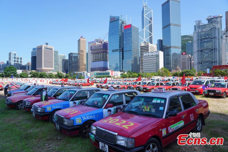 A total of 100 taxis hanging the Chinese national flags and posters display the number of 25 to mark the 25th anniversary of Hong Kong's return to the motherland in the Hong Kong Special Administrative Region, June 28, 2022. (Photo: China News Service/Li Zhihua)