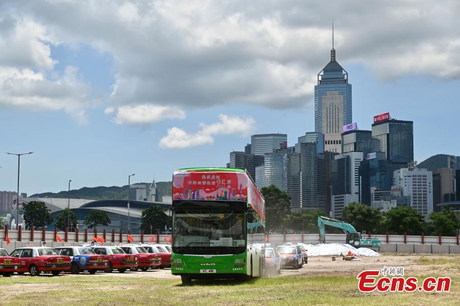 Sightseeing buses and taxis hanging the Chinese national flags and the Hong Kong Special Administrative Region (HKSAR) flags participate in a parade to mark the 25th anniversary of Hong Kong's return to the motherland, June 28, 2022. (Photo: China News Service/Li Zhihua)