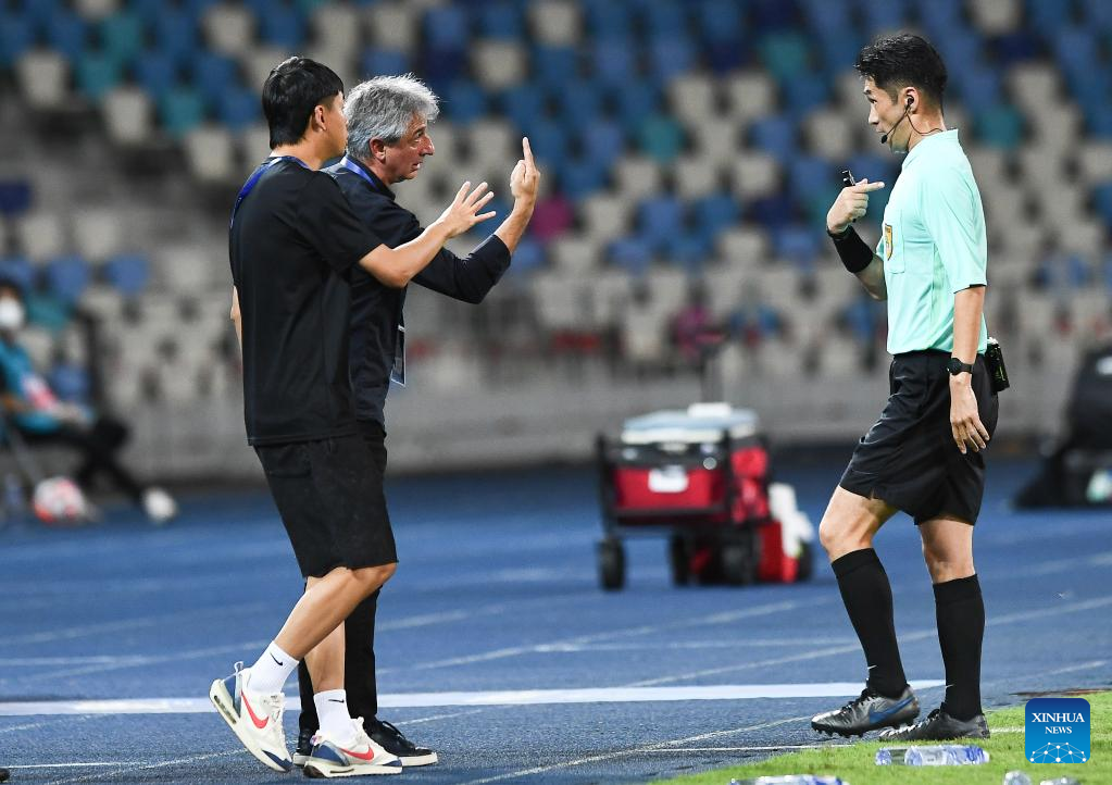 Coach Jordi Vinyals (C) of Zhejiang talks to referee during a 2022 season Chinese Football Association Super League (CSL) match between Changchun Yatai and Zhejiang in Haikou, south China's Hainan Province, June 29, 2022. (Xinhua/Yang Guanyu)