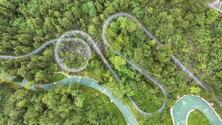 Aerial photo taken on June 25, 2022 shows the Taohuayuan National Forest Park in southwest China's Chongqing municipality. (People's Daily Online/Qiu Hongbin)