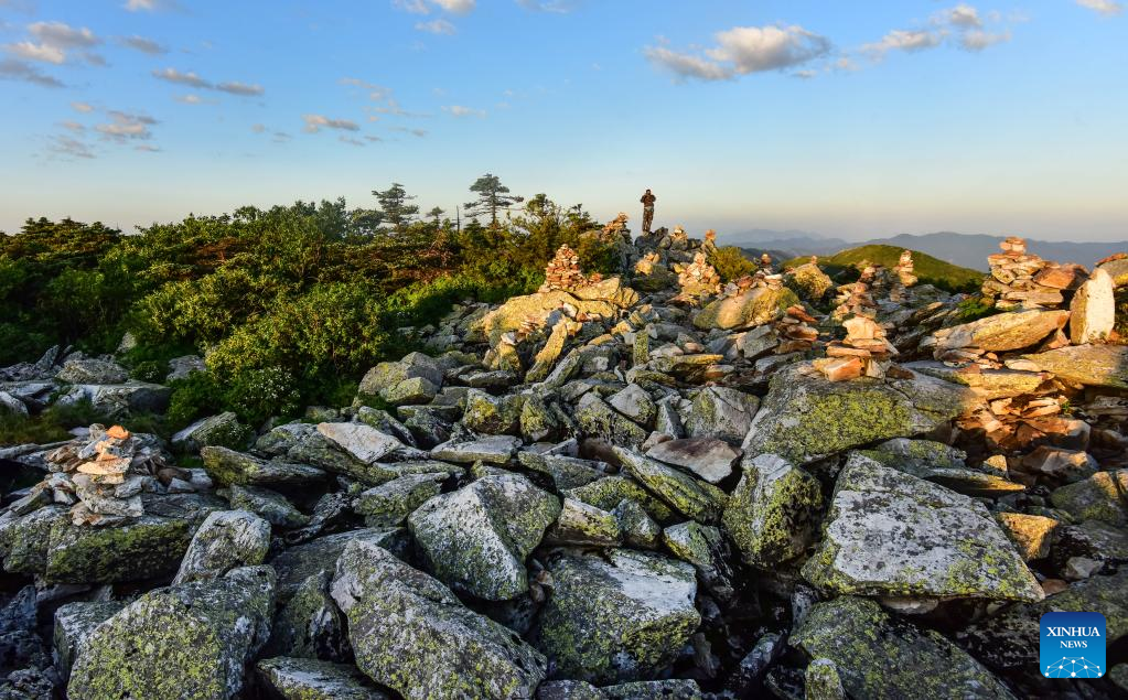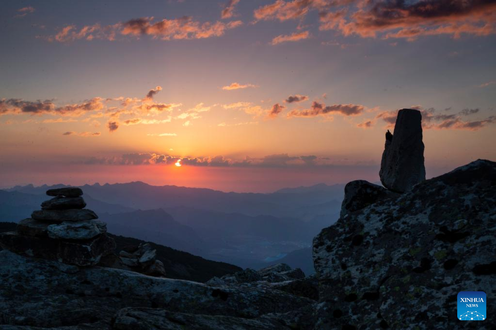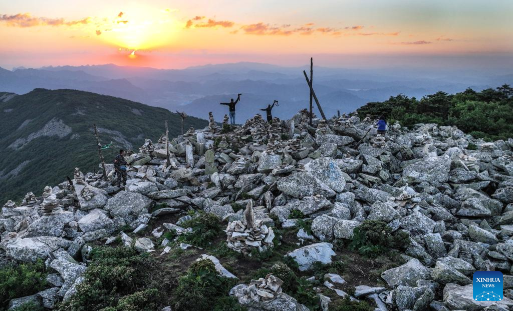 Photo taken on June 29, 2022 show the sunrise at Caolianling mountain in Luonan County of Shangluo City, northwest China's Shaanxi Province. Caolianling, 2,646 meters above sea level, is covered by lush vegetation and has obvious vertical distribution of plants. (Xinhua/Tao Ming)