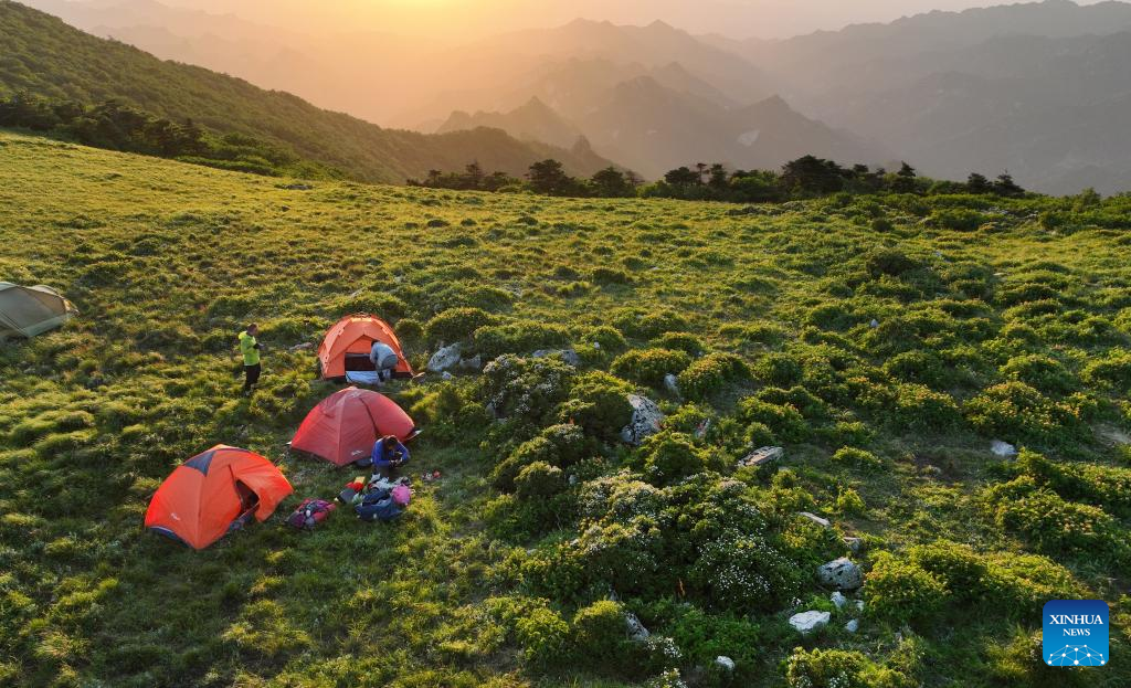 Aerial photo taken on June 28, 2022 shows tourists camping at Caolianling mountain in Luonan County of Shangluo City, northwest China's Shaanxi Province. Caolianling, 2,646 meters above sea level, is covered by lush vegetation and has obvious vertical distribution of plants. (Xinhua/Tao Ming)