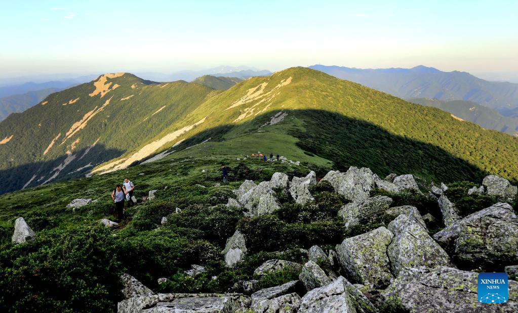 Tourists visit Caolianling mountain in Luonan County of Shangluo City, northwest China's Shaanxi Province, June 29, 2022. Caolianling, 2,646 meters above sea level, is covered by lush vegetation and has obvious vertical distribution of plants. (Xinhua/Tao Ming)