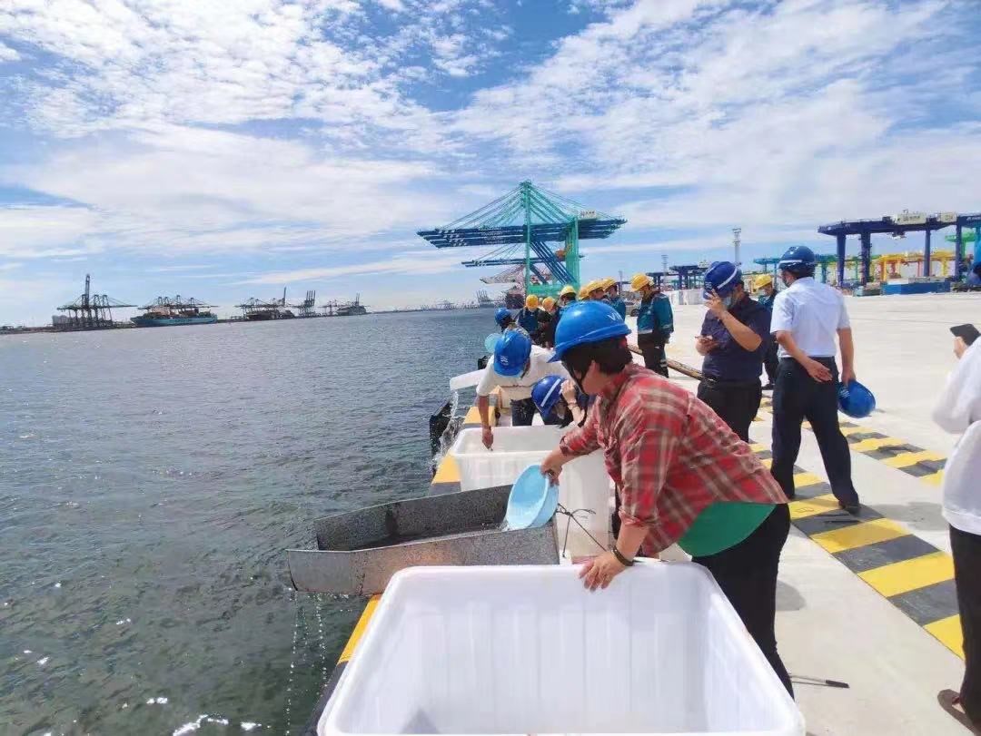 Nearly 10,000 four-gilled perch fries are released into the Bohai Sea during an activity held by Tianjin Port Second Container Terminal Co., Ltd., June 2021. (Photo courtesy of the convergence media center of Tianjin's Binhai New Area)
