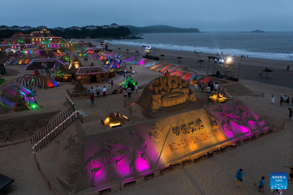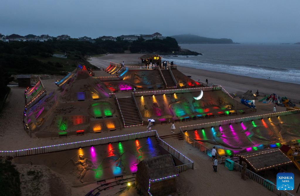 Aerial photo taken on June 28, 2022 shows the sand sculpture display zone decorated by lights at night in Zhoushan, east China's Zhejiang Province. The 23rd Zhoushan International Sand Sculpture Festival opened here recently, with over 60 sand sculptures greeting the public. (Xinhua/Xu Yu)