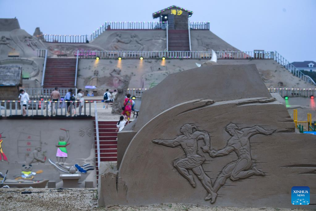 People visit the sand sculpture display zone in Zhoushan, east China's Zhejiang Province, June 28, 2022. The 23rd Zhoushan International Sand Sculpture Festival opened here recently, with over 60 sand sculptures greeting the public. (Xinhua/Xu Yu)