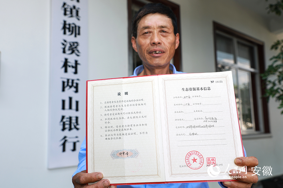 Xu Xuefeng, a villager from Liuxi village, Jingde county, east China’s Anhui Province, shows a certificate which proves that he is a beneficiary of the ecological resources transfer program. (People’s Daily Online/Zhang Jun)