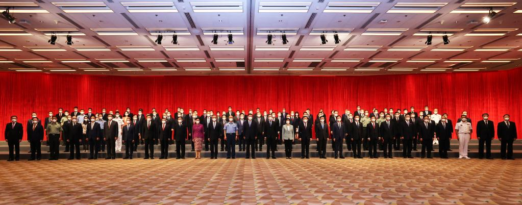 Chinese President Xi Jinping, also general secretary of the Communist Party of China Central Committee and chairman of the Central Military Commission, meets with central government officials based in Hong Kong and senior executives of Hong Kong branches of mainland enterprises and institutions, in Hong Kong, south China, June 30, 2022. (Xinhua/Ju Peng)