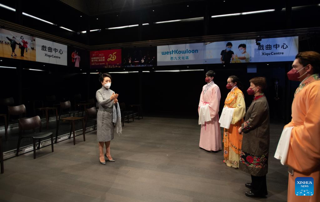 Peng Liyuan, wife of Chinese President Xi Jinping, watches rehearsals of Cantonese opera performances during her visit to the Xiqu Center in the West Kowloon Cultural District, in Hong Kong, south China, June 30, 2022. (Xinhua/Xie Huanchi)