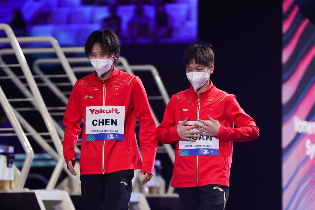 Chen Yuxi (L)/Quan Hongchan of China show up prior to the women's 10m synchronised final of diving at the 19th FINA World Championships in Budapest, Hungary, June 30, 2022. (Xinhua/Zheng Huansong)