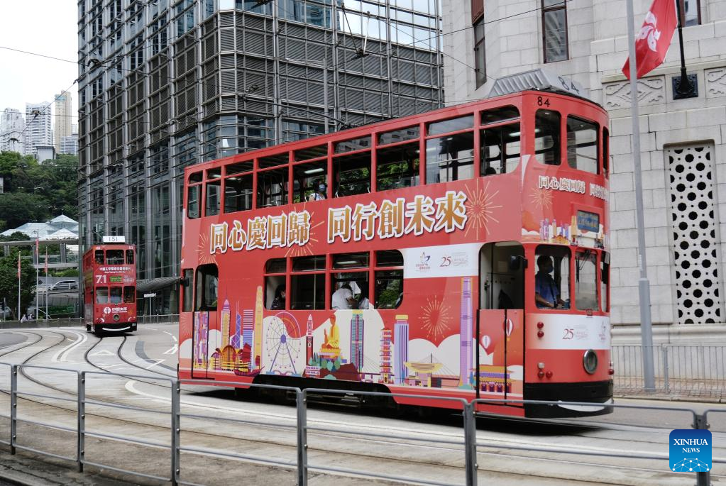 A bus painted with posters marking the 25th anniversary of Hong Kong's return to the motherland runs in Hong Kong, south China, June 30, 2022. July 1 is the celebration day for the 25th anniversary of Hong Kong's return to the motherland. (Xinhua/Wang Shen)