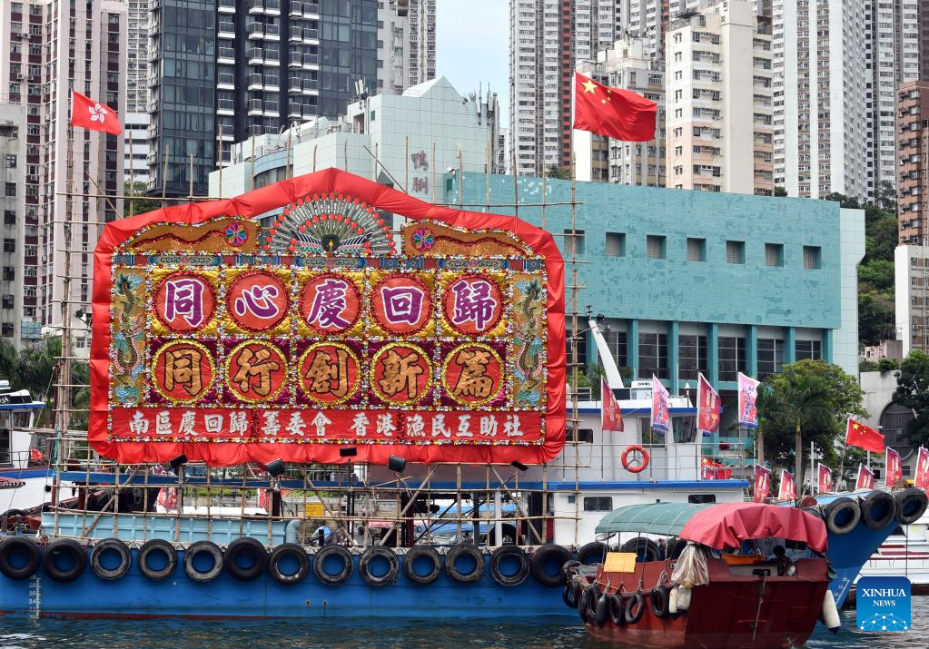 A fishing vessel with China's national flag and the Hong Kong Special Administrative Region (HKSAR) flag and flower plaque is seen in Hong Kong, south China, June 30, 2022. July 1 is the celebration day for the 25th anniversary of Hong Kong's return to the motherland. (Xinhua/Lo Ping Fai)