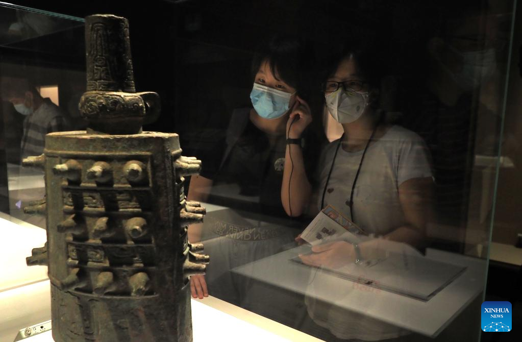 A visitor takes photos of an exhibit at Shanghai Museum in Shanghai, east China, July 1, 2022. (Xinhua/Ren Long)