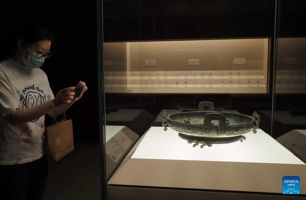 A visitor takes photos of an exhibit at Shanghai Museum in Shanghai, east China, July 1, 2022. (Xinhua/Ren Long)