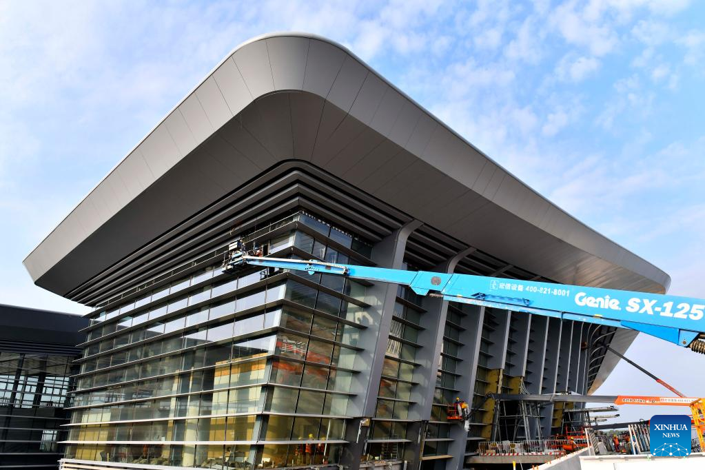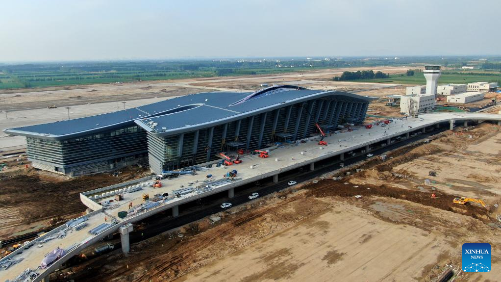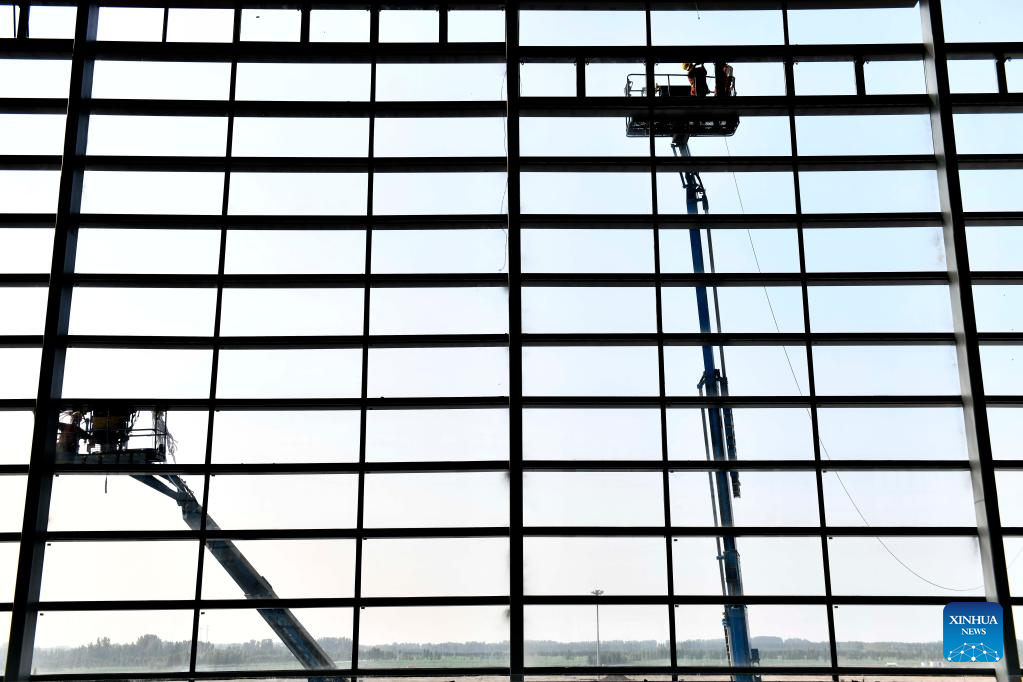 Workers are seen at the construction site of Da'an Airport terminal in Jining, east China's Shandong Province, July 1, 2022. (Xinhua/Guo Xulei)