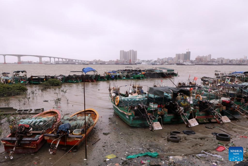 Fishing boats take shelter from the wind near Bohewan bridge in Maoming, south China's Guangdong Province, July 2, 2022. Chaba, the third typhoon of the year, made landfall in the coastal area of Maoming City at around 3 p.m. Saturday. (Xinhua/Huang Guobao)