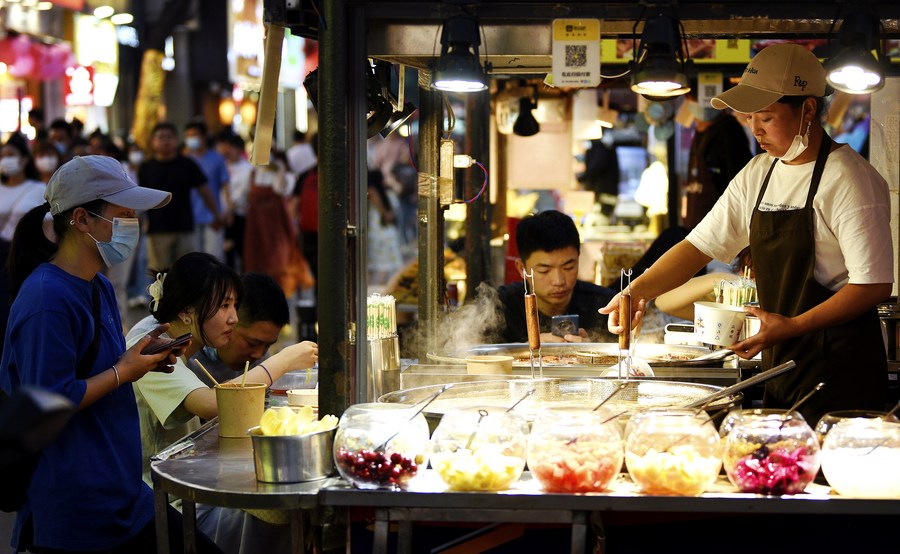People eat at a food stall of a commercial street in Xi'an, northwest China's Shaanxi Province, June 5, 2022. (Xinhua/Liu Xiao)