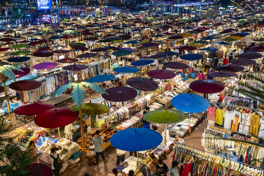 Photo taken on March 17, 2022 shows a night market in Jinghong City, Xishuangbanna Dai Autonomous Prefecture, southwest China's Yunnan Province. (Xinhua/Chen Xinbo)
