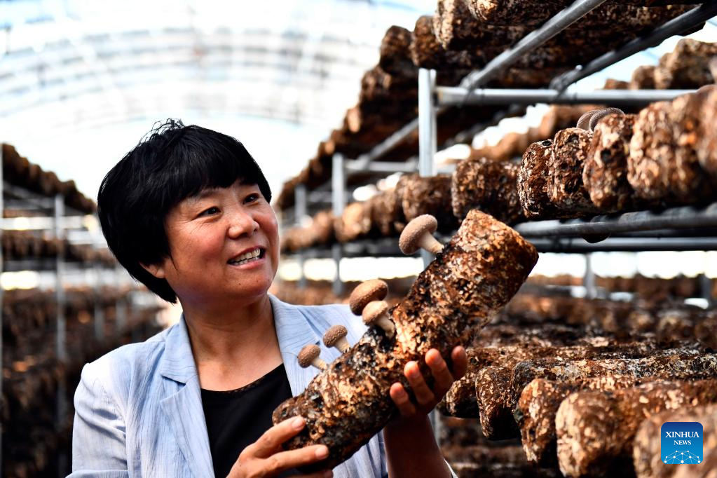 A villager picks edible fungi at a greenhouse in Hongniya Village in Wulian County of Rizhao, east China's Shandong Province, June 17, 2022. Hongniya Village used to be a poverty-stricken village. In recent years, village cadre Zhang Shouying has taken a series of measures to help the villagers get rid of poverty and live a better life. In 2021, under the professional guidance of Shandong Agricultural University, Hongniya Village developed the cultivation of edible fungi, which has helped increase villagers' income and boost rural revitalization. (Xinhua/Guo Xulei)
