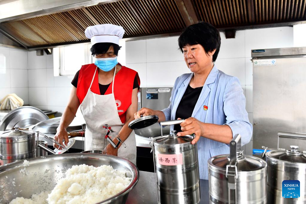 Zhang Shouying (R) learns about the meals at the kitchen of a care center for the elderly in Hongniya Village in Wulian County of Rizhao, east China's Shandong Province, June 17, 2022. Hongniya Village used to be a poverty-stricken village. In recent years, village cadre Zhang Shouying has taken a series of measures to help the villagers get rid of poverty and live a better life. In 2021, under the professional guidance of Shandong Agricultural University, Hongniya Village developed the cultivation of edible fungi, which has helped increase villagers' income and boost rural revitalization. (Xinhua/Guo Xulei)