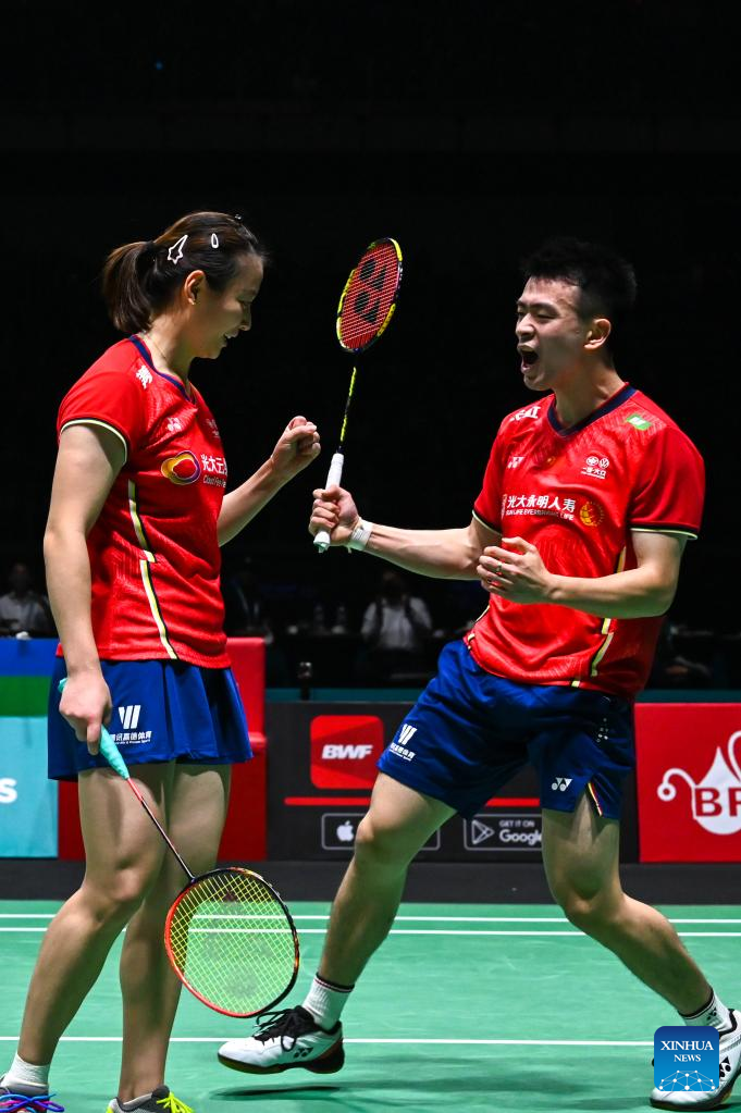 Zheng Siwei(L)/Huang Yaqiong celebrate scoring during the mixed doubles final match between Zheng Siwei/Huang Yaqiong of China and Dechapol Puavaranukroh/Sapsiree Taerattanachai of Thailand at Malaysia Open 2022 badminton tournament in Kuala Lumpur, Malaysia, July 3, 2022. (Xinhua/Zhu Wei)