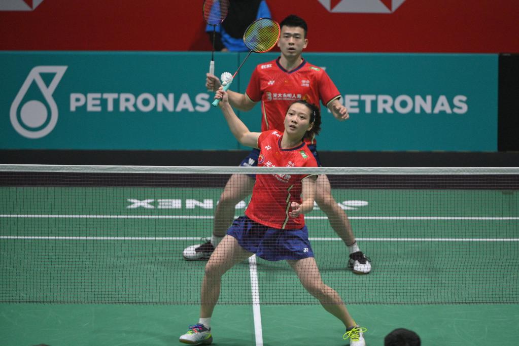 Zheng Siwei/Huang Yaqiong(front) compete during the mixed doubles final match between Zheng Siwei/Huang Yaqiong of China and Dechapol Puavaranukroh/Sapsiree Taerattanachai of Thailand at Malaysia Open 2022 badminton tournament in Kuala Lumpur, Malaysia, July 3, 2022. (Photo by Chong Voon Chung/Xinhua)