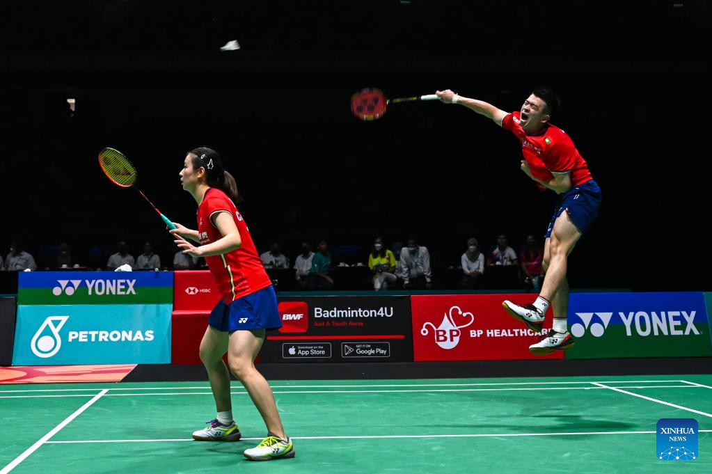 Zheng Siwei (R)/Huang Yaqiong compete during the mixed doubles final match between Zheng Siwei/Huang Yaqiong of China and Dechapol Puavaranukroh/Sapsiree Taerattanachai of Thailand at Malaysia Open 2022 badminton tournament in Kuala Lumpur, Malaysia, July 3, 2022. (Xinhua/Zhu Wei)