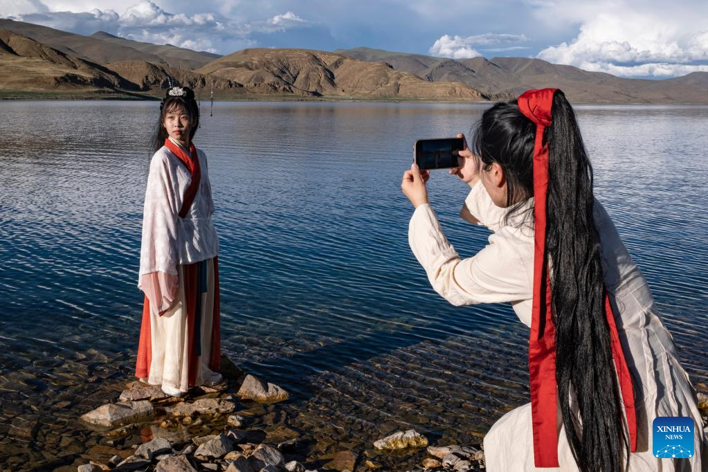 Visitors take pictures by the lakeside of Yamdrok Lake in Nagarze County of Shannan City, southwest China's Tibet Autonomous Region, July 2, 2022. (Xinhua/Sun Fei)