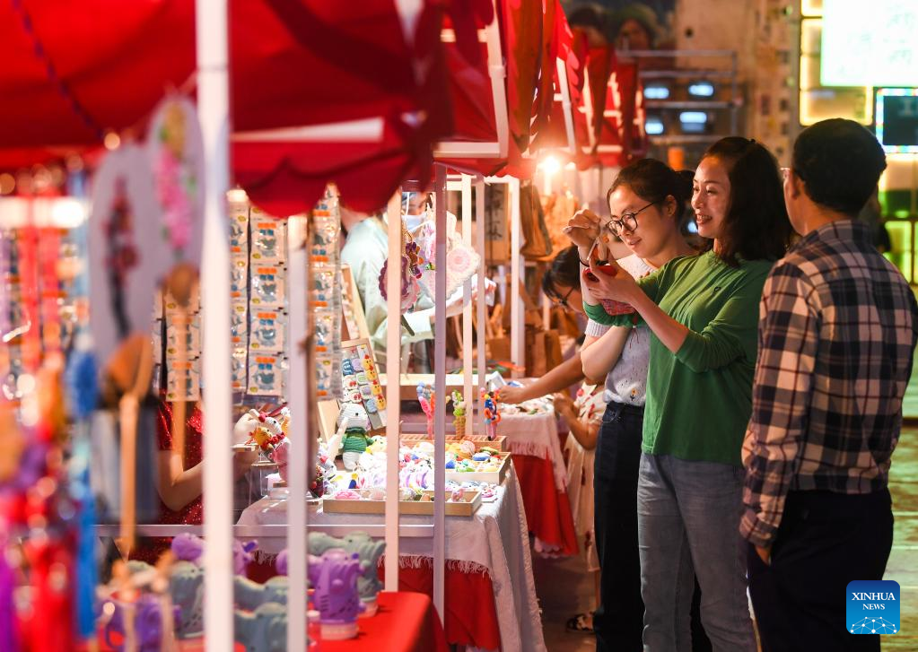 People choose commodities at a commercial street in southwest China's Chongqing Municipality, June 5, 2022. Under COVID-19 prevention and control measures, Chongqing in southwest China has striven to combine its night economy with culture and tourism in innovative ways, thus enhancing the vitality and attraction of nighttime consumption and turbocharging its development. (Xinhua/Wang Quanchao)