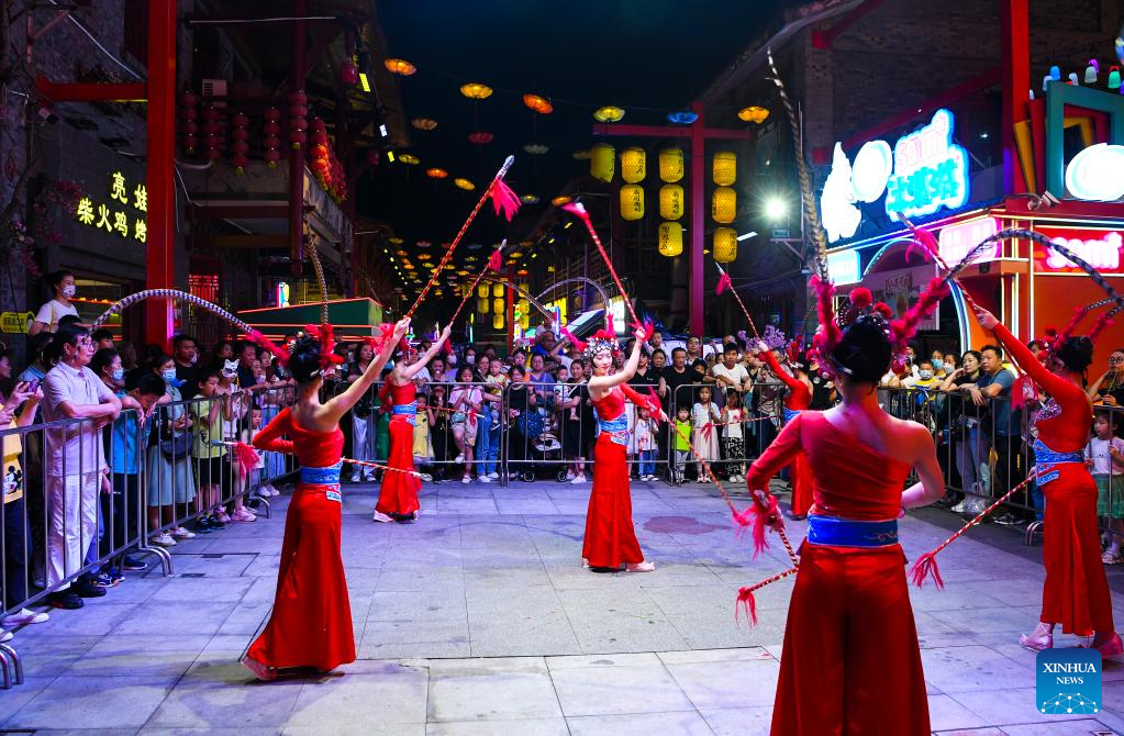 People watch an art performance at a commercial street in southwest China's Chongqing Municipality, June 1, 2022. Under COVID-19 prevention and control measures, Chongqing in southwest China has striven to combine its night economy with culture and tourism in innovative ways, thus enhancing the vitality and attraction of nighttime consumption and turbocharging its development. (Xinhua/Wang Quanchao)
