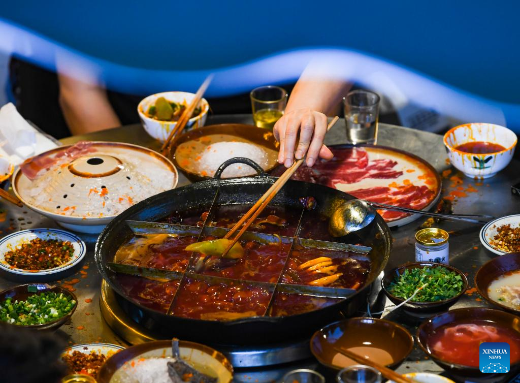 People enjoy a meal at a hot pot restaurant at a commercial street in southwest China's Chongqing Municipality, June 5, 2022. Under COVID-19 prevention and control measures, Chongqing in southwest China has striven to combine its night economy with culture and tourism in innovative ways, thus enhancing the vitality and attraction of nighttime consumption and turbocharging its development. (Xinhua/Wang Quanchao)