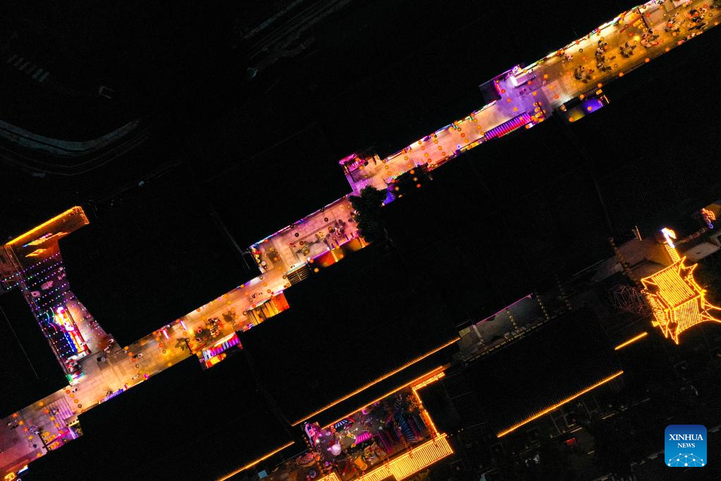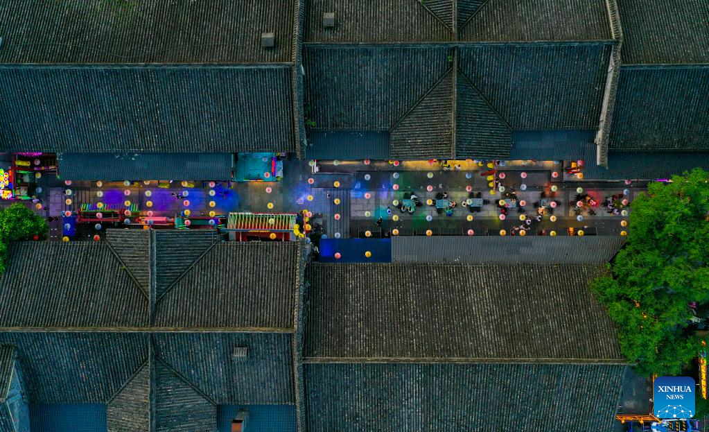 Aerial photo taken on June 1, 2022 shows people visiting a commercial street in southwest China's Chongqing Municipality. Under COVID-19 prevention and control measures, Chongqing in southwest China has striven to combine its night economy with culture and tourism in innovative ways, thus enhancing the vitality and attraction of nighttime consumption and turbocharging its development. (Xinhua/Wang Quanchao)