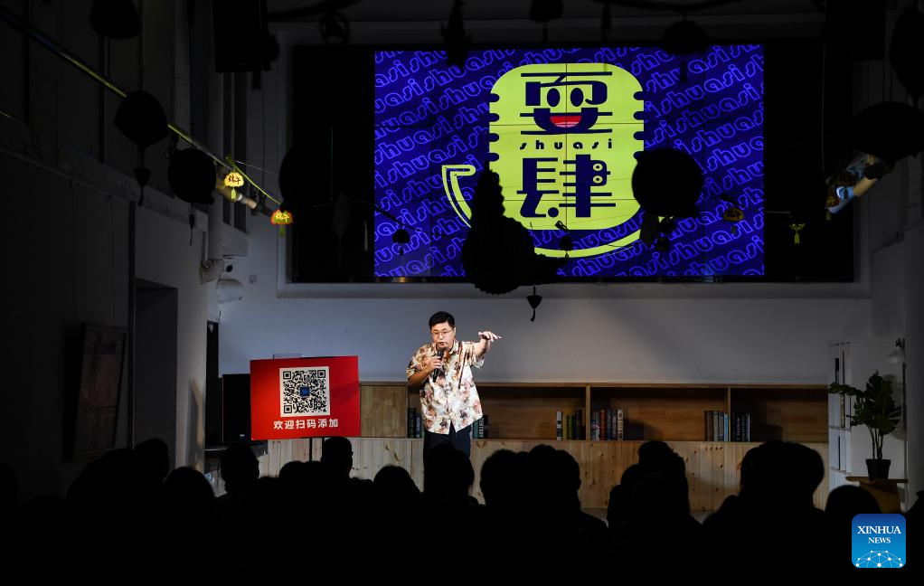 People watch a stand-up comedy at a theater in Beicang Cultural and Creative Block in southwest China's Chongqing Municipality, June 3, 2022. Under COVID-19 prevention and control measures, Chongqing in southwest China has striven to combine its night economy with culture and tourism in innovative ways, thus enhancing the vitality and attraction of nighttime consumption and turbocharging its development. (Xinhua/Wang Quanchao)