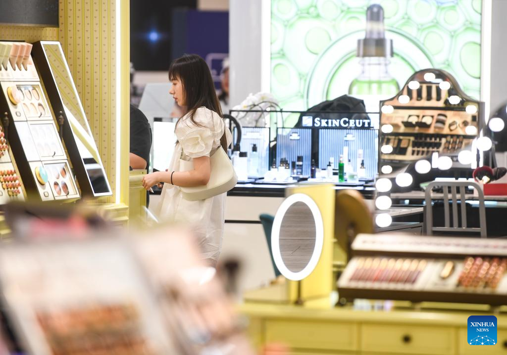 A customer purchases cosmetic products at a shopping mall in southwest China's Chongqing Municipality, July 3, 2022. Under COVID-19 prevention and control measures, Chongqing in southwest China has striven to combine its night economy with culture and tourism in innovative ways, thus enhancing the vitality and attraction of nighttime consumption and turbocharging its development. (Xinhua/Wang Quanchao)