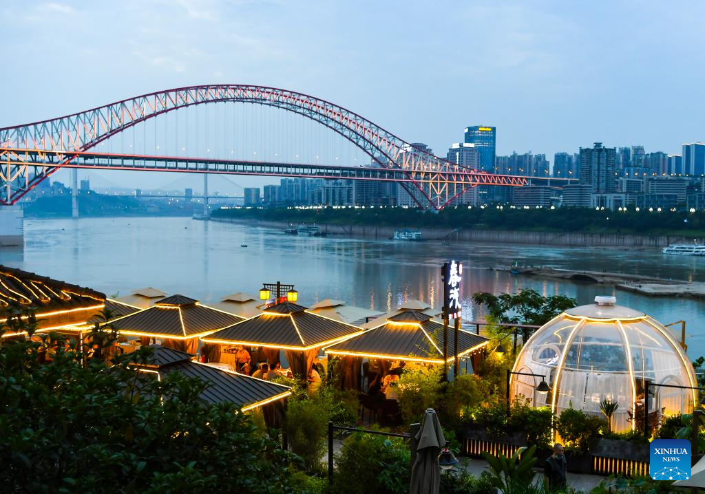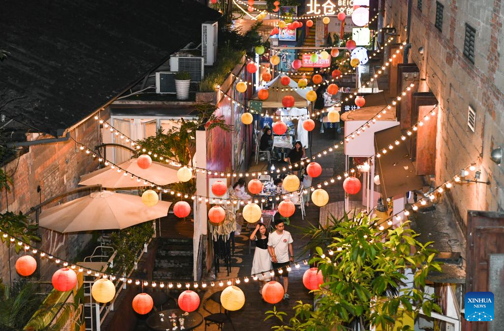 People visit the Beicang Cultural and Creative Block in southwest China's Chongqing Municipality, June 3, 2022. Under COVID-19 prevention and control measures, Chongqing in southwest China has striven to combine its night economy with culture and tourism in innovative ways, thus enhancing the vitality and attraction of nighttime consumption and turbocharging its development. (Xinhua/Wang Quanchao)