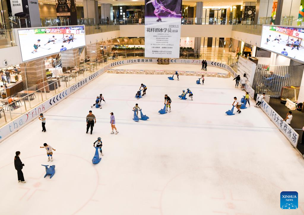 People enjoy skating at an ice rink of a shopping mall in southwest China's Chongqing Municipality, June 26, 2022. Under COVID-19 prevention and control measures, Chongqing in southwest China has striven to combine its night economy with culture and tourism in innovative ways, thus enhancing the vitality and attraction of nighttime consumption and turbocharging its development. (Xinhua/Wang Quanchao)