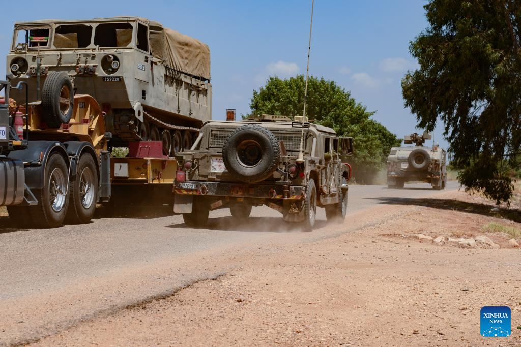Israeli military vehicles patrol the border with Lebanon near the Israeli Kibbutz of Malkia, on July 3, 2022. (AYAL MARGOLIN/JINI via Xinhua)