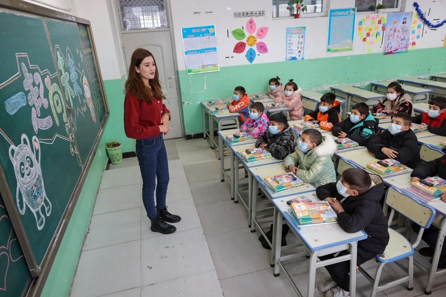Students have class at a boarding primary school in the county seat of the Taxkorgan Tajik autonomous county, Northwest China's Xinjiang Uygur autonomous region, on Feb 26, 2022. [Photo/Xinhua]