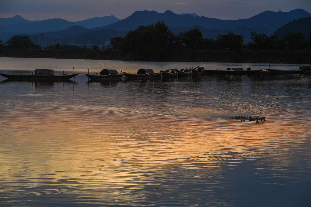 Photo taken on July 3, 2022 shows the scenery at dusk in Sandu Fishing Village of Jiande City, east China's Zhejiang Province. (Xinhua/Xu Yu)