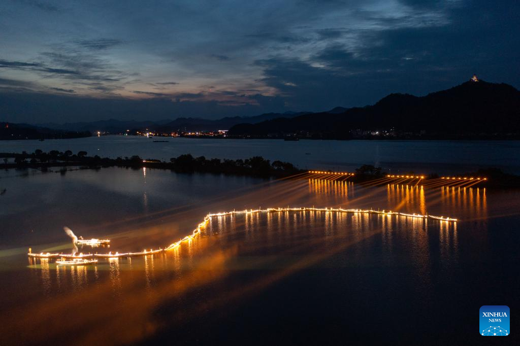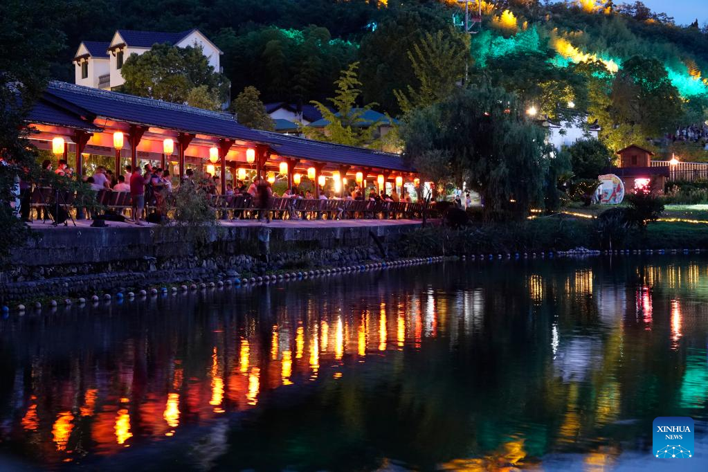 People enjoy night view during a folk festival in Sandu Fishing Village of Jiande City, east China's Zhejiang Province, July 3, 2022. (Xinhua/Xu Yu)