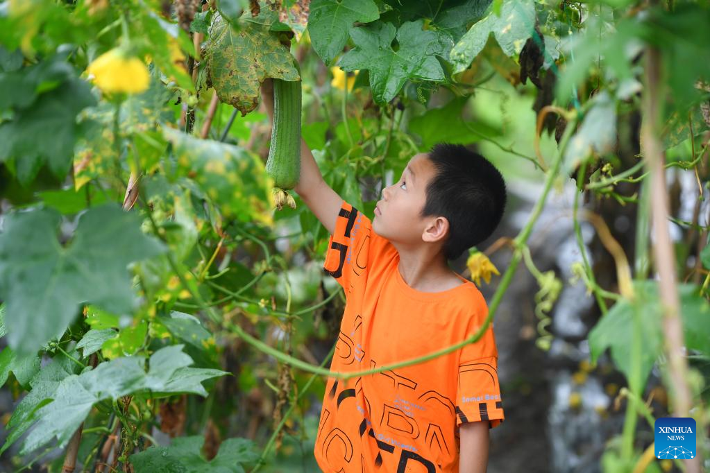 A boy picks a towel gourd at a base to experience agrarian culture in Tongzi Village of Xiangtan City, central China's Hunan Province, July 4, 2022. (Xinhua/Chen Zeguo)