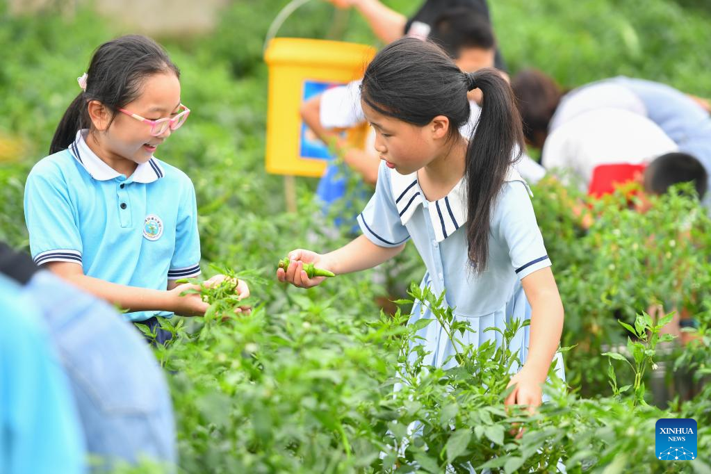 Children pick hot peppers at a base to experience agrarian culture in Tongzi Village of Xiangtan City, central China's Hunan Province, July 4, 2022. (Xinhua/Chen Zeguo)