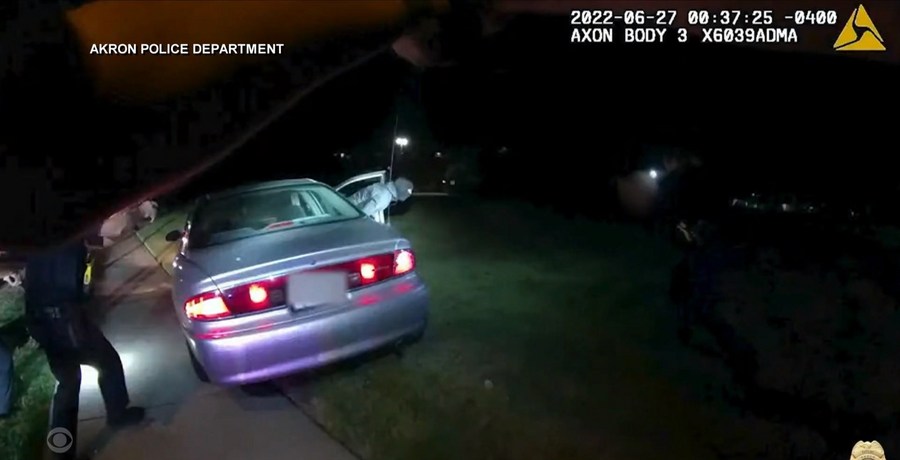 The screenshot taken from the police-released body camera footage shows Jayland Walker exiting his car before being chased and shot by several officers in Arkon in the U.S. state of Ohio on June 27, 2022. (Xinhua)