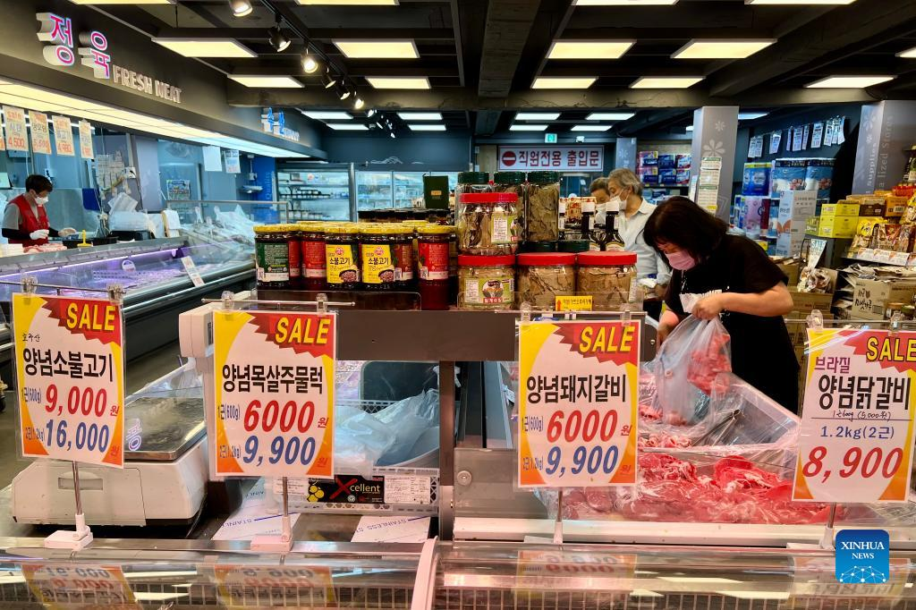 People shop at a supermarket in Seoul, South Korea, June 5, 2022. South Korea's headline inflation hit the highest in nearly 24 years in June owing to surging energy prices and higher eating-out costs, statistical office data showed Tuesday. (Xinhua/Wang Yiliang)