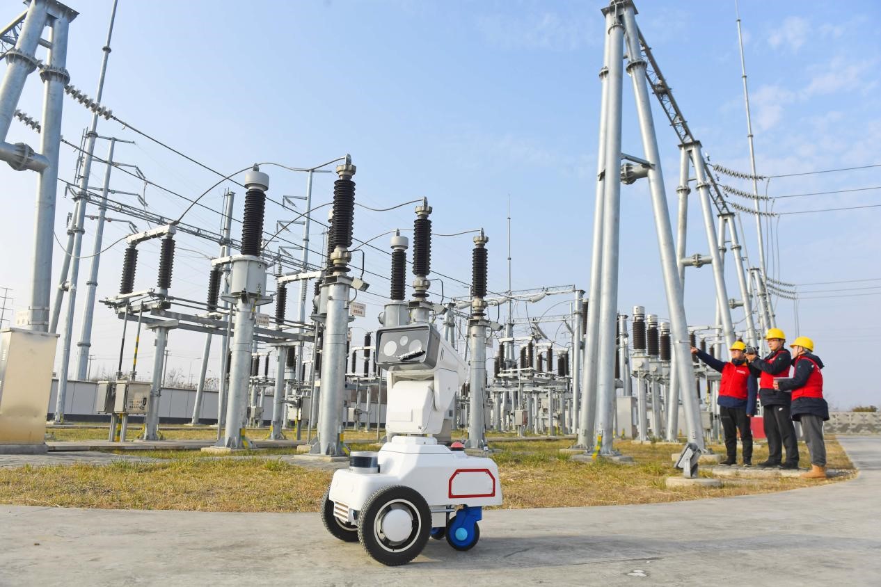 A 5G-enabled inspection robot inspects a power facility in Chuzhou, east China's Anhui province together with maintenance staff, Jan. 17, 2022. (People's Daily Online/Song Weixing)