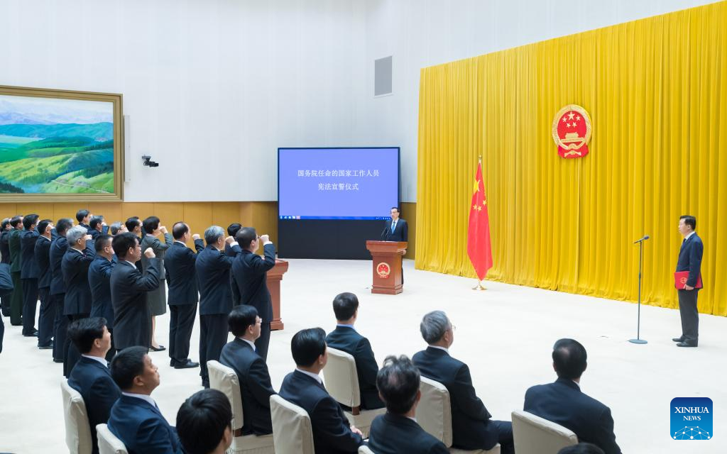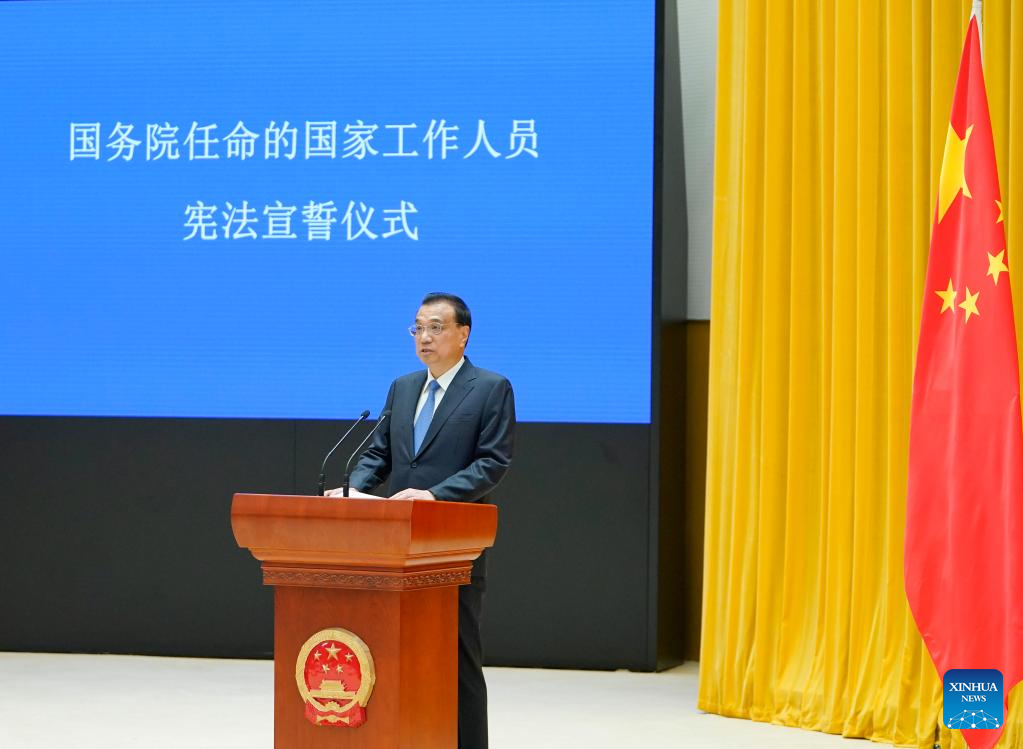 The ceremony was overseen by Premier Li Keqiang, who urged the oath-takers to fulfill their pledge by taking on responsibilities and taking real actions.