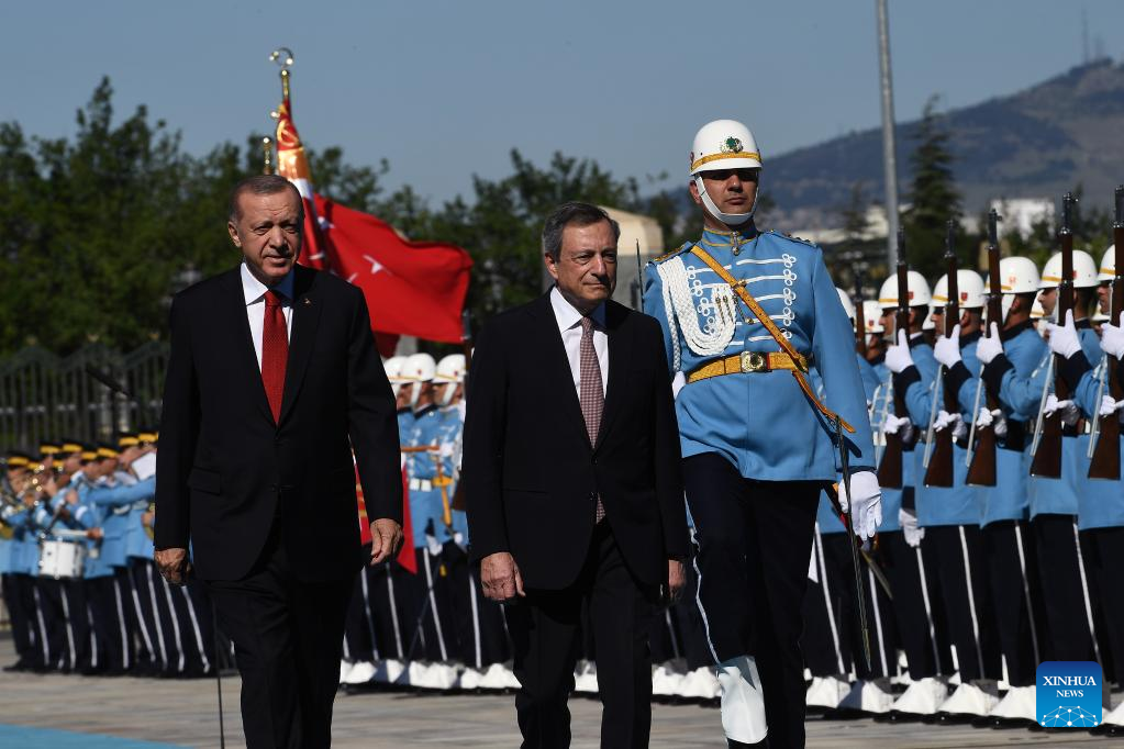 Turkish President Recep Tayyip Erdogan (L, Front) welcomes Italian Prime Minister Mario Draghi in Ankara, Turkey, on July 5, 2022. Turkish President Recep Tayyip Erdogan vowed to enhance economic cooperation with Italy, particularly in the fields of energy and defense. Erdogan made the remarks after he held the third intergovernmental meeting with Italian Prime Minister Mario Draghi in Ankara, where the two countries signed nine new agreements on bilateral cooperation. (Photo by Mustafa Kaya/Xinhua)
